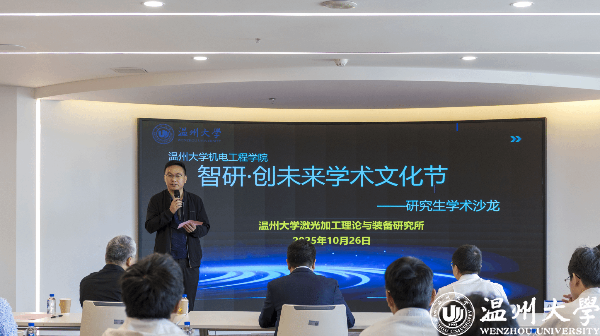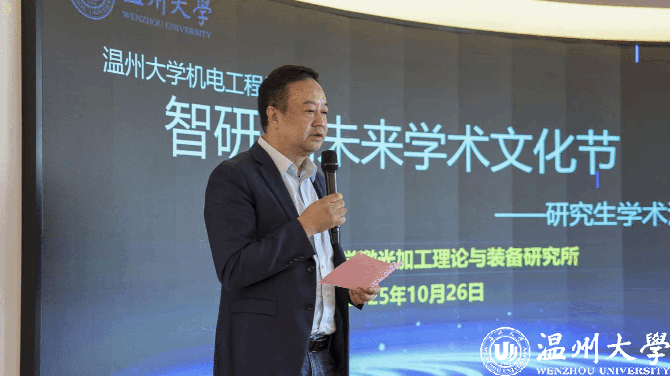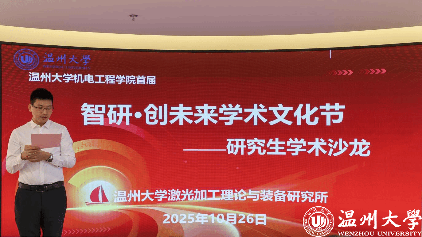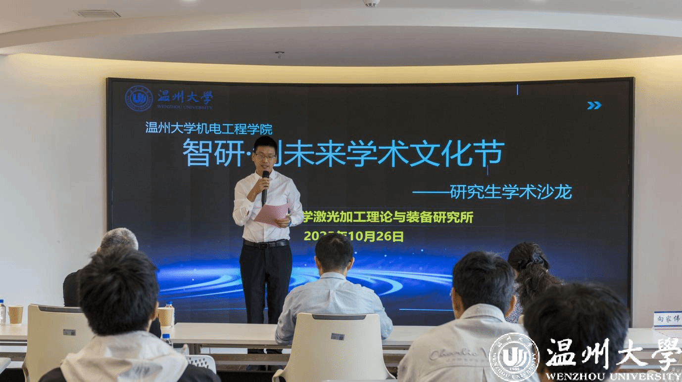 为搭建研究生学术交流平台、激发科研创新思维能力,2025年10月26日,由温州大学机电工程学院主办,温州大学激光加工理论与装备研究所承办的首届“智研・创未来”学术文化节暨研究生学术沙龙在科技综合大楼515路演厅顺利开展。机电工程学院院长向家伟、研究生院副院长李勇,机电工程学院副院长朱德华、张斌斌,创新创业学院创新创业科科长李剑军,机电工程学院副教授刘文文及50余名师生齐聚一堂,共赴一场聚焦前沿、碰撞思想的学术盛宴。活动由温州大学激光加工理论与装备研究所秘书王艳虎老师主持。