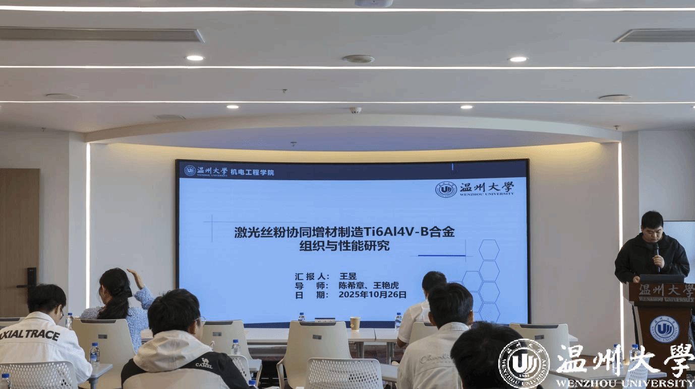 随后,王昱同学以《激光丝粉协同增材制造 ti6al4v-b 合金组织与性能研究》为题,详细阐述了激光增材制造技术在钛合金材料中的应用,通过对比不同工艺参数下合金的微观组织与力学性能,为优化该类合金的制备工艺提供了实验依据;