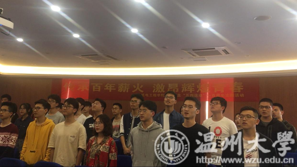 2019年4月29日下午,机电工程学院在学院309开展“五四运动”一百周年主题活动。机电工程学院党总支书记周荣、学生科辅导员孙双、郑妤、胡施施以及团委学生会全体成员参加此次活动。