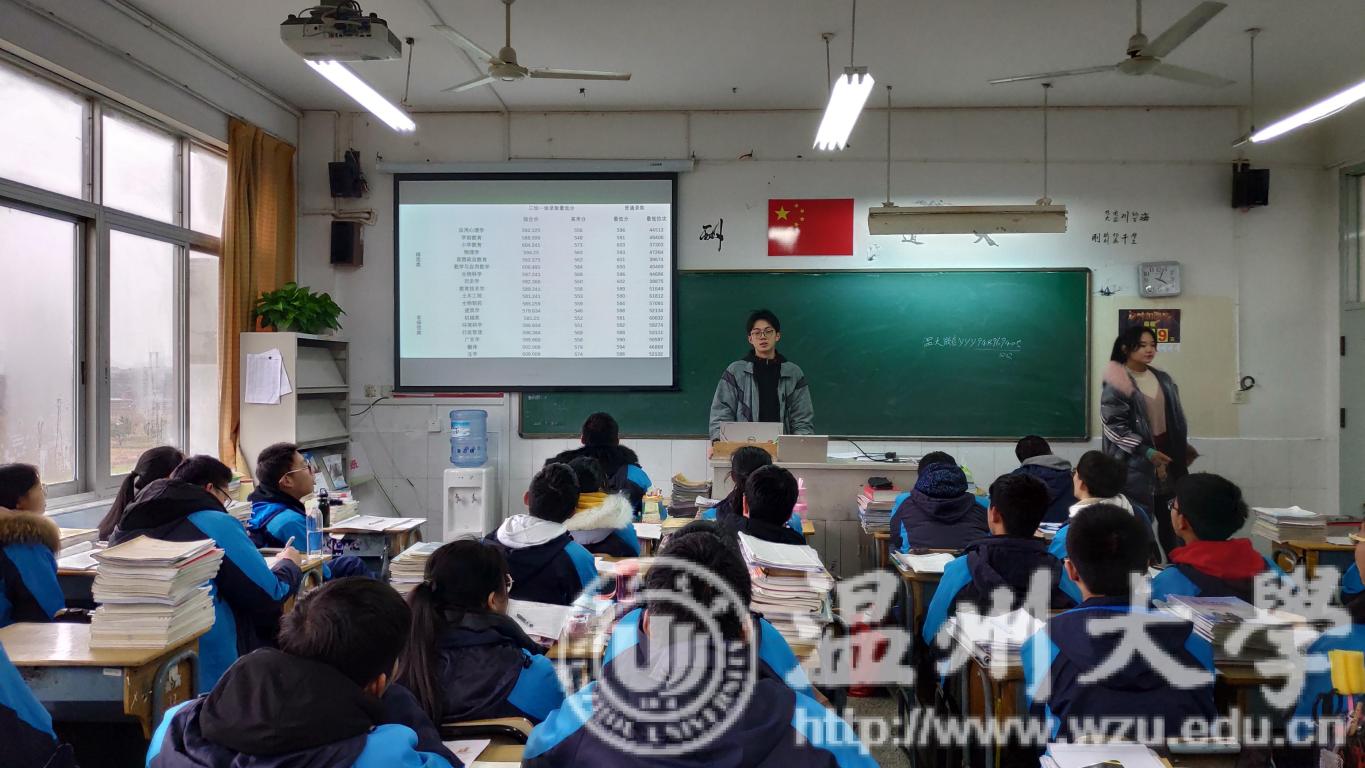 为了弘扬爱校精神,积极宣传推介母校,同时也为提高学生的社会实践能力,加强在校学生与中学母校的联系,我院现开展“感恩母校行•共筑成长梦”寒假回访母校社会实践活动。在凛凛寒冬假日里,我院优秀学子组成10余支回访队伍,回访范围覆盖到温州、宁波、衢州、绍兴、丽水、临安、台州、海宁、义乌等省内10余个市,怀着赤诚之心回访高中母校,深入班级,向广大高中学子详细介绍温大情况、分享学习经验。