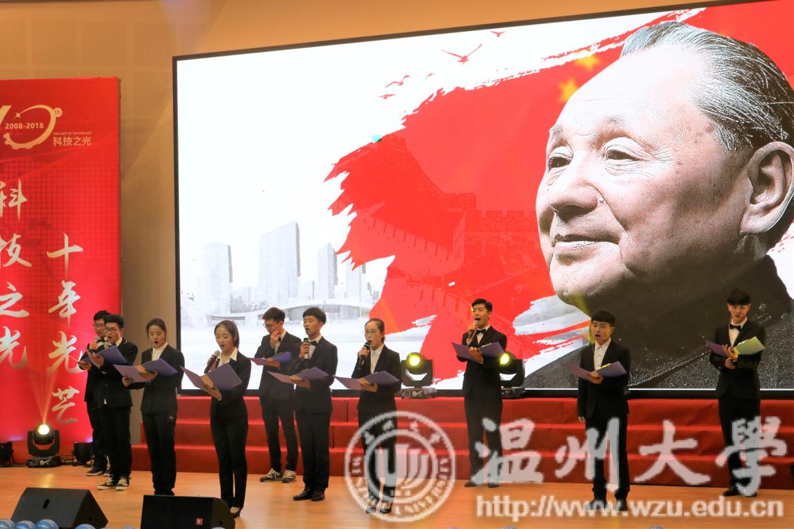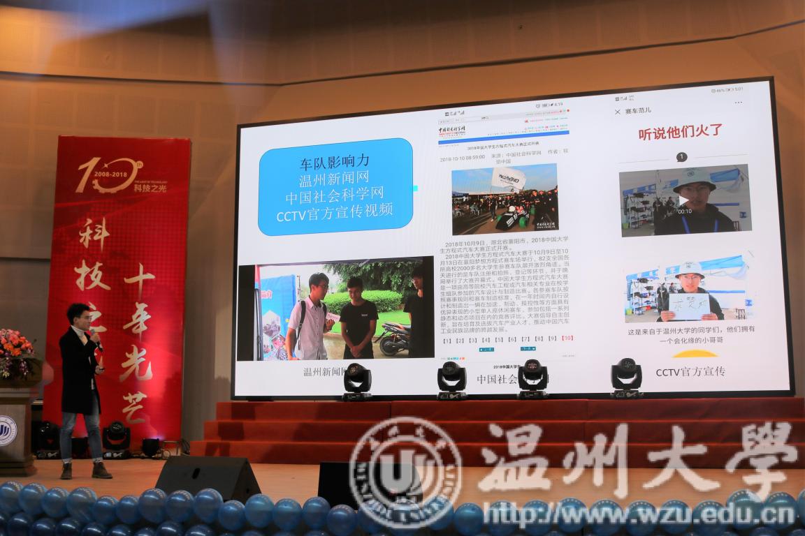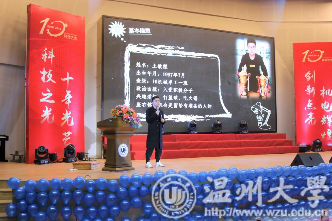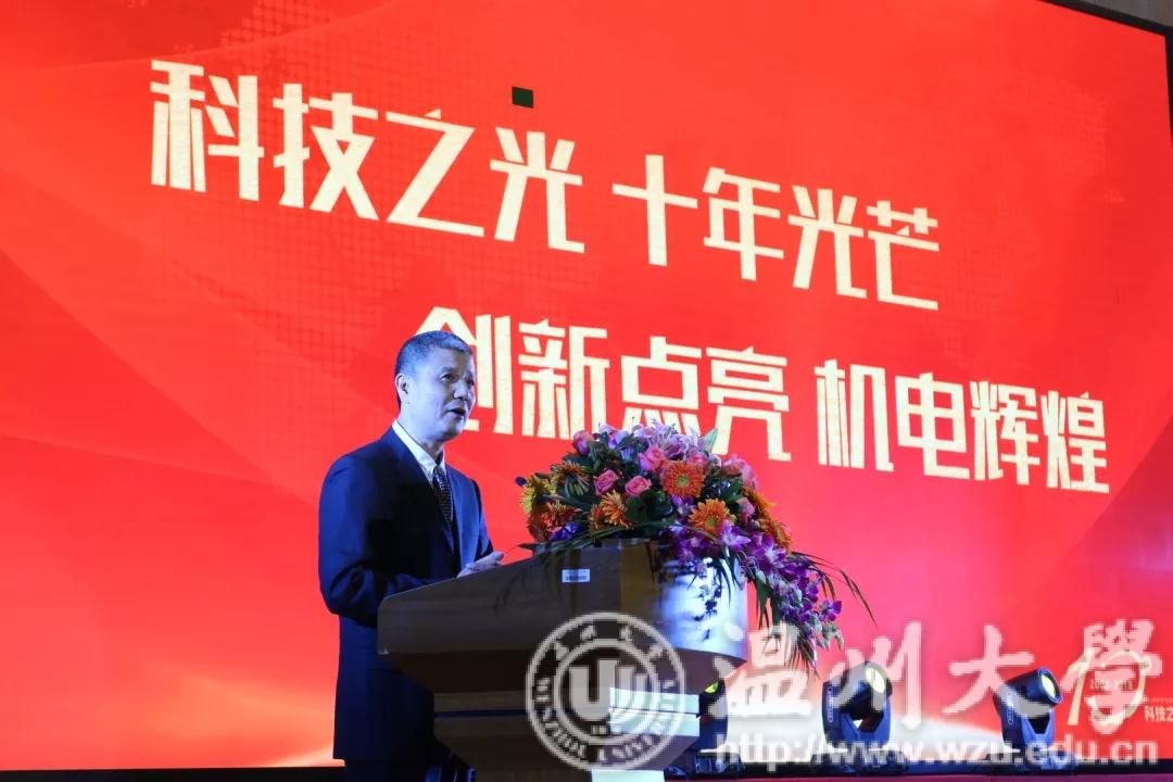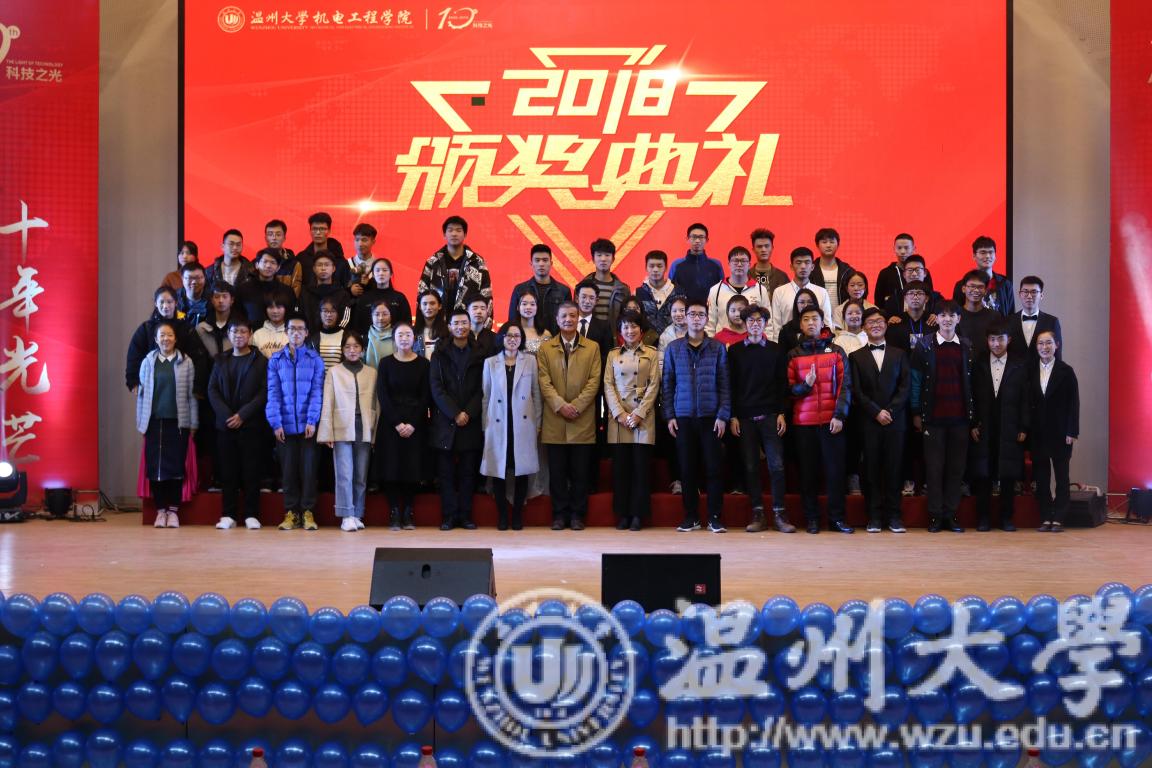 2018年12月19日18:30,为了表彰机电学子在这一年中获得的丰硕果实,同时为了庆祝科技之光活动月举办十周年,温州大学机电学院在南校九号楼报告厅举办了2018年度颁奖典礼暨科技之光十周年庆典。出席本次典礼的有温州大学学生处副处长高红星、宁波兴茂电子科技有限公司罗中伦博士、机电工程学院党总支书记周荣、机电工程学院党总支副书记李密、机电工程学院机械工程系主任周晨、机电工程学院车辆工程系主任龙江启、机电工程学院工业工程系主任黄沈权、机电工程学院教学科科长叶熹僖、机电工程学院团委书记孙双与来自各专业、各教研室、各科室的教师代表。